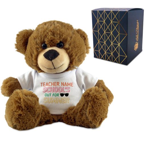 These super soft teddy bears are the perfect gift for anyone; Our adorable teddy bears are not only soft and cuddly, but they also come beautifully presented in their own gift box. Measuring approximately 8 inches, they are made from the softest polyester, and with button eyes and a big smile, they are sure to bring joy to anyone who receives them. Each bear comes dressed in a white t-shirt, which is printed with your customised design in bright, full colour, making it a unique and personalised gift. And for added convenience, the t-shirt is easily removable, so you can wash it or the bear if necessary without worrying about damaging the design. The design features a pair of sunglasses and the bold text “School’s Out for Summer” in bright, pop colours. The teacher’s name is also personalised in a vibrant hue above the design. Our personalised teddy bears are sure to be treasured for years to come – and with their gift box packaging, they make a wonderful present that is ready to give on any occasion.