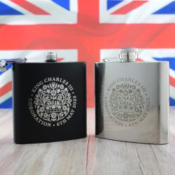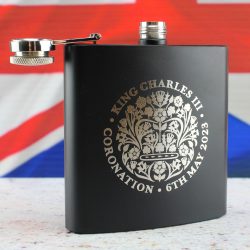 Celebrate the coronation of King Charles the III and the Queen Consort with our King’s Coronation Emblem black hip flask. Engraved with the official Coronation Emblem for HRH on 6th May 2023, this flask makes for a sentimental piece to remember the historic, regal event; perfect for coronation parties and celebrations, a gift for a royal family fan or even as a keepsake for the coronation, this flask suits all. The coronation emblem was created by Sir Jony Ive KBE and his creative collective LoveFrom, and displays St Edward’s crown comprised of the flora from the four nations of Great Britain. Etched with our laser engraving system, the emblem will be permanently etched into this flask, ensuring this keepsake will be lasting and cherished for years to come. A classic and traditional flask, this holds 6oz and is made from sturdy stainless steel, completed with a stylish matt black finish. This coronation flask is the perfect way to show support to the monarchy and a great token to remember the King’s Coronation.