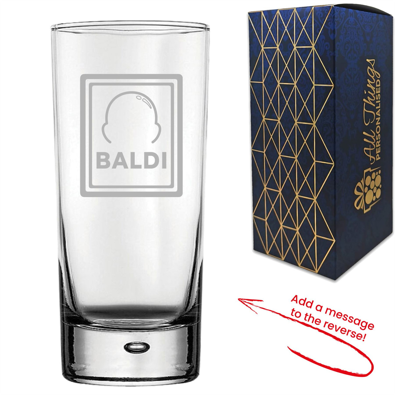Give a good laugh to any bald friend or family member with our engraved novelty Baldi hiball tumbler! This is the best gift for dad, grandad, friends and work colleagues, and is great for birthdays, Fathers Day, retirements and secret santa. Featuring a bold and humorous novelty design, make this present extra special by adding a dedicated personal message on the reverse side; simply select “Add Message on Reverse” to include your customisation, and with a choice of different fonts, you can stylize your personalisation to add a unique touch to your gift. Accompanied with a stunning blue and gold gift box, you won’t need to worry about presentation and can give your gift straight to the recipient. Etched with our laser engraving system, the featured design and your personalisation will be permanently inscribed onto this glass, ensuring your gift will be lasting and cherished for years to come. Made special with a fun design and your personalised message, this glass is guaranteed to bring a smile to anyone’s face.