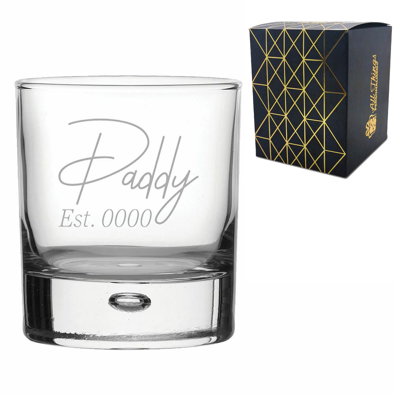 Personalise your glass with any date! This is an ideal, personal gift for any father, and is great for birthdays, Fathers day and new parents. With a set design, all that’s missing is your personalised date.This glass measures to 84mm x 93mm, and holds 11.5oz/330ml. With a bubble base, this is a classy, high quality gift. Please note: the bubble may not be central.
