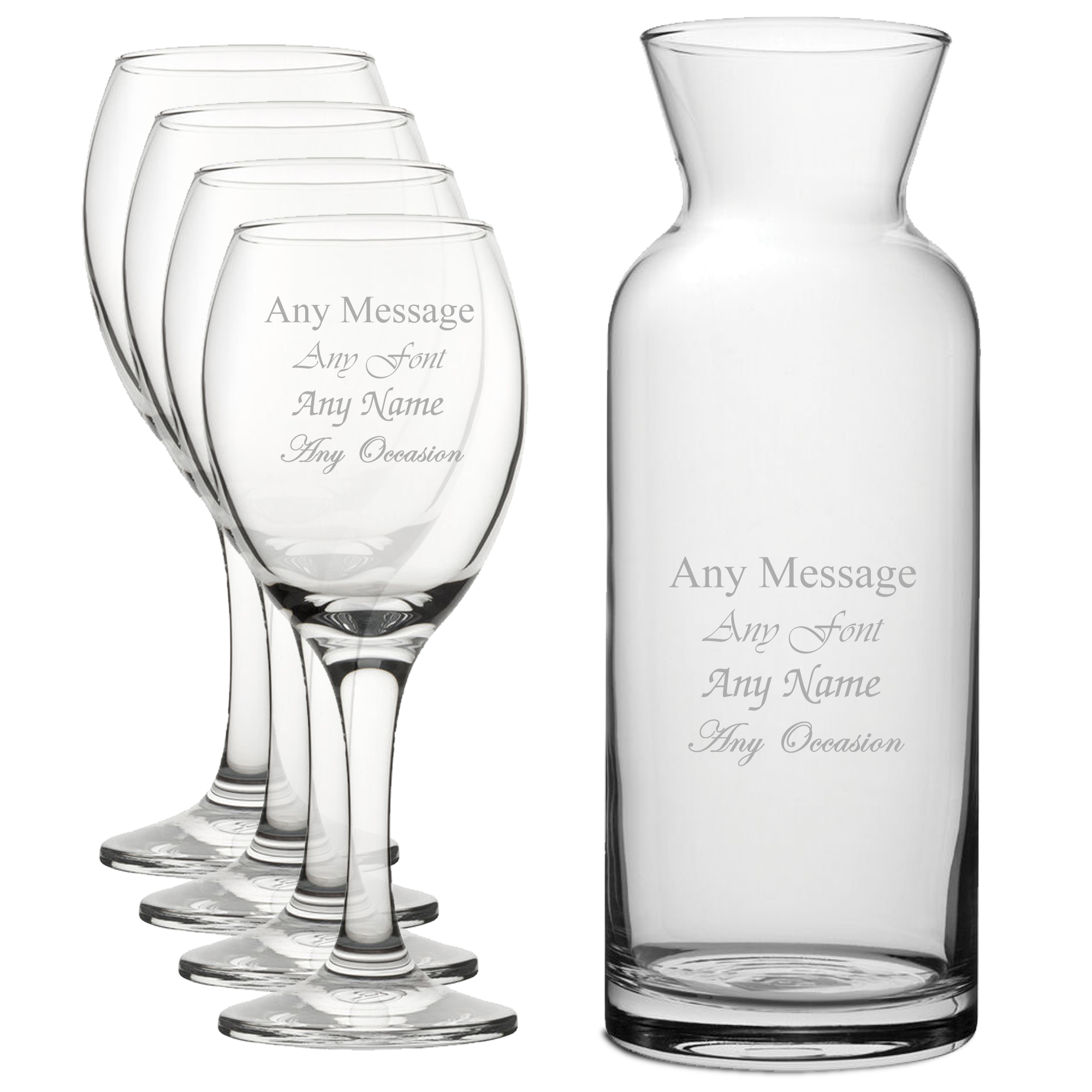 Personalise your wine glass and carafe set with any message for any occasion! The perfect present for any wine connoisseur, this is ideal for birthdays, Christmas, anniversaries, weddings and retirements. In addition with your personalisation, choose from any of our fonts to tailor your customisation to suit anyone and add an extra special touch to a remarkable gift. All accompanied with individual stunning gift boxes, you won’t need to worry about presentation. Etched with our laser engraving system, the featured design and your personalisation will be permanently etched into the glasses and carafe, ensuring your gift will be lasting and cherished for years to come. The glasses in this set presents a classic design, featuring a rounded bowl upon a sturdy stem; suitable for red, white and rose wine, this is a versatile drinking glass. Traditionally shaped, these glasses are perfect for any wine lover. The carafe in this set is versatile yet stylish, presenting straight sides that flow up to a flared rim – a charming carafe, perfect for any wine.