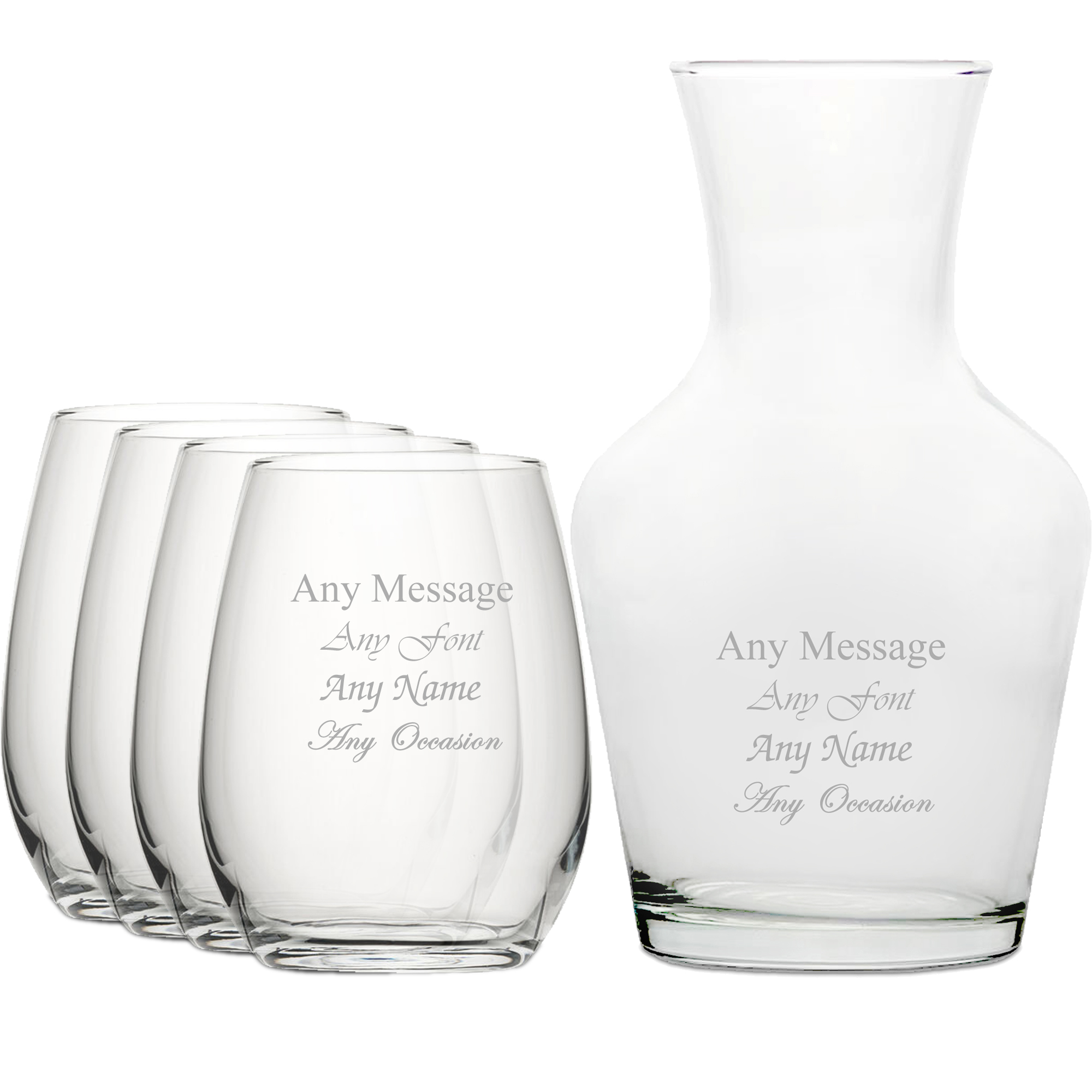 Personalised Engraved Set of 4 Stemless Wine Glass and 1 Litre Vin Carafe Set