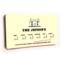Personalise this cream 6 hook key hanger with House design by adding a title, such as you family name and what is to be hung on each hook.